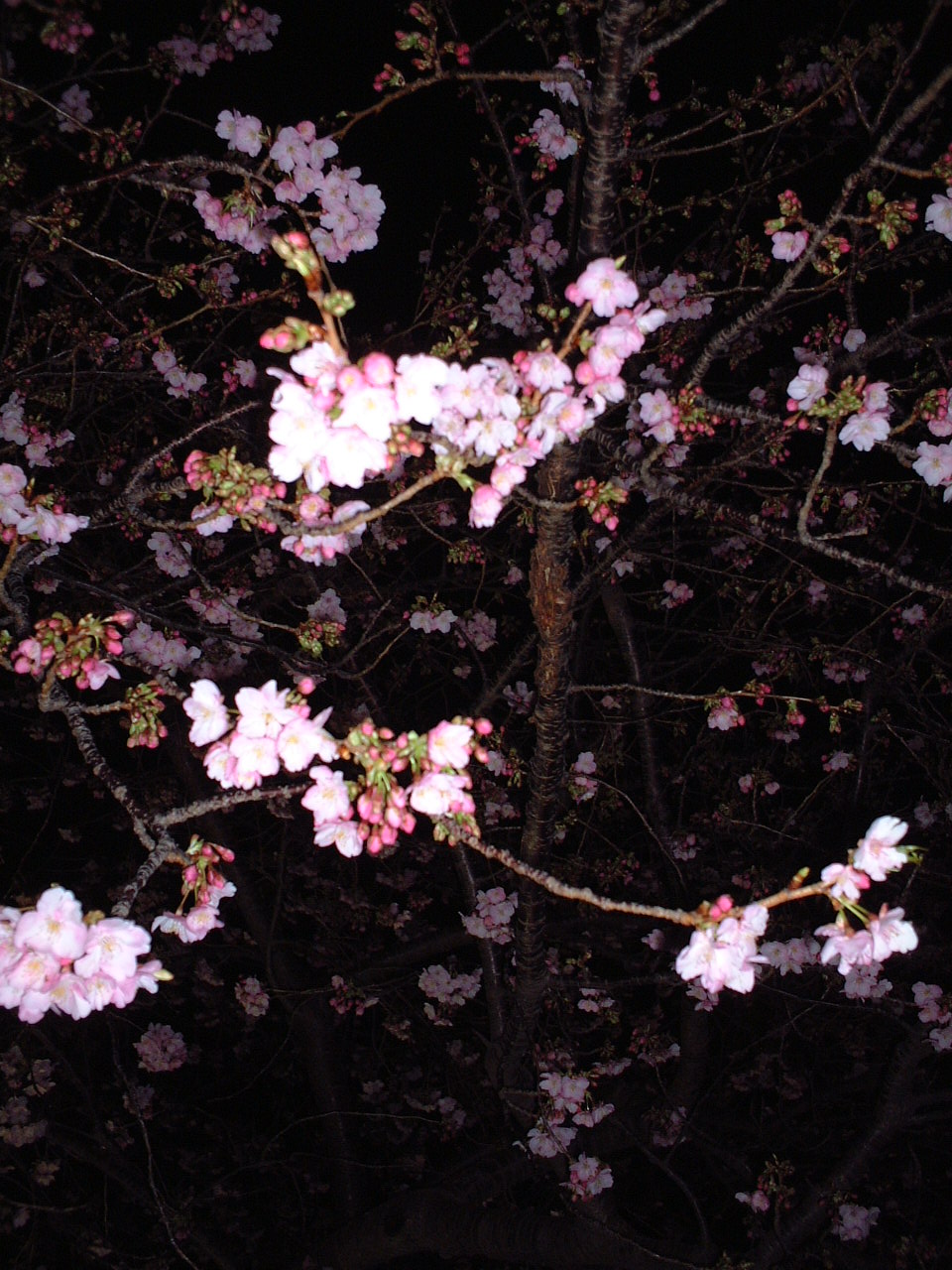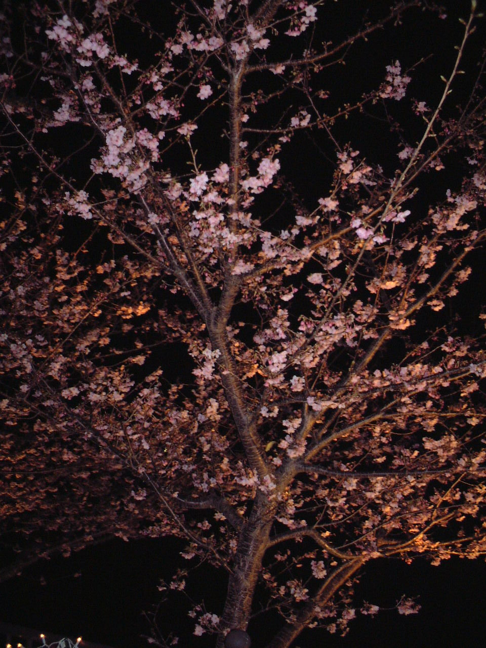 18-21 時にやっている夜桜ライトアップが見たいと言われたのですがそのあいだ待つには寒いので踊り子温泉会館へ行くことにしました。もと来た方向へ戻り豊泉橋からは河津川の南岸を辿りました。18 時頃ようやく到着しました。駅前で貰った「河津桜まつりお花見マップ」を片手に辿りついたのですが受付の人がこれで割引になりますと 900 円で入ることができました。日が暮れていて足先まで冷えていたのですが体の芯まで温まりました。18:40 頃にまた駅のほうに戻ったのですがその途中に峰温泉会場という場所があってそこでも夜桜ライトアップしていました。